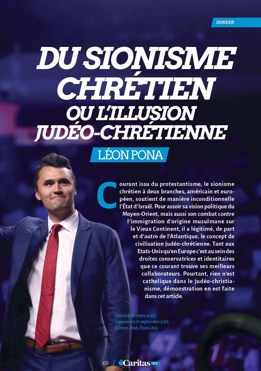 Ce dossier décortique également l’impact du sionisme dans les milieux chrétiens, en définissant, grâce au professeur de droit, Franck Bouscau, cette notion de Judéo-Christianisme : Le Judéo-Christianisme ? Ques aco ? Et en s’intéressant, dans l’article Du sionisme chrétien ou l’illusion judéo-chrétienne, à ce courant issu du protestantisme qui nous vient des Etats-Unis et dont Charlie Kirk fut un représentant éminent.