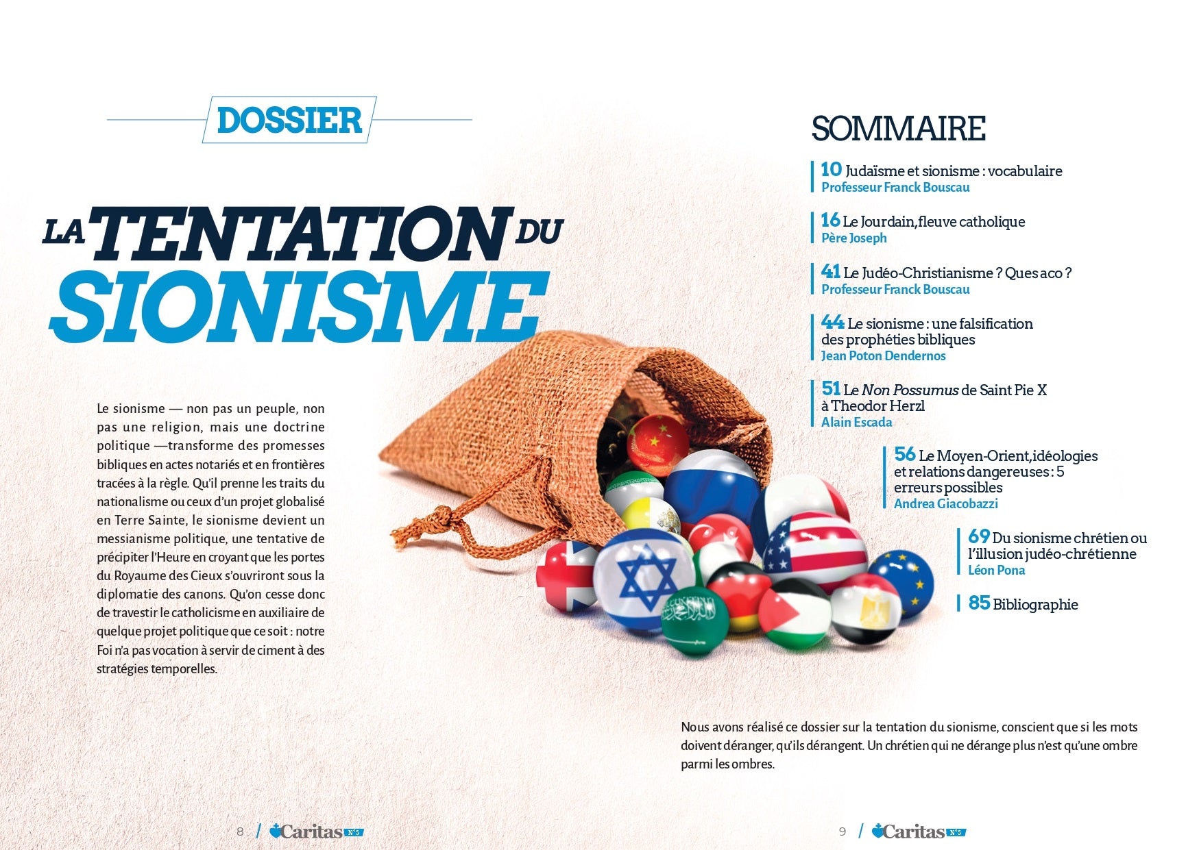 Le numéro 5 de la revue Caritas, la revue du pays réel, spécial 100 pages, a décidé de se pencher sur cette tentation du sionisme qui habite les droites conservatrices américaines et européennes et les milieux catholiques et chrétiens.